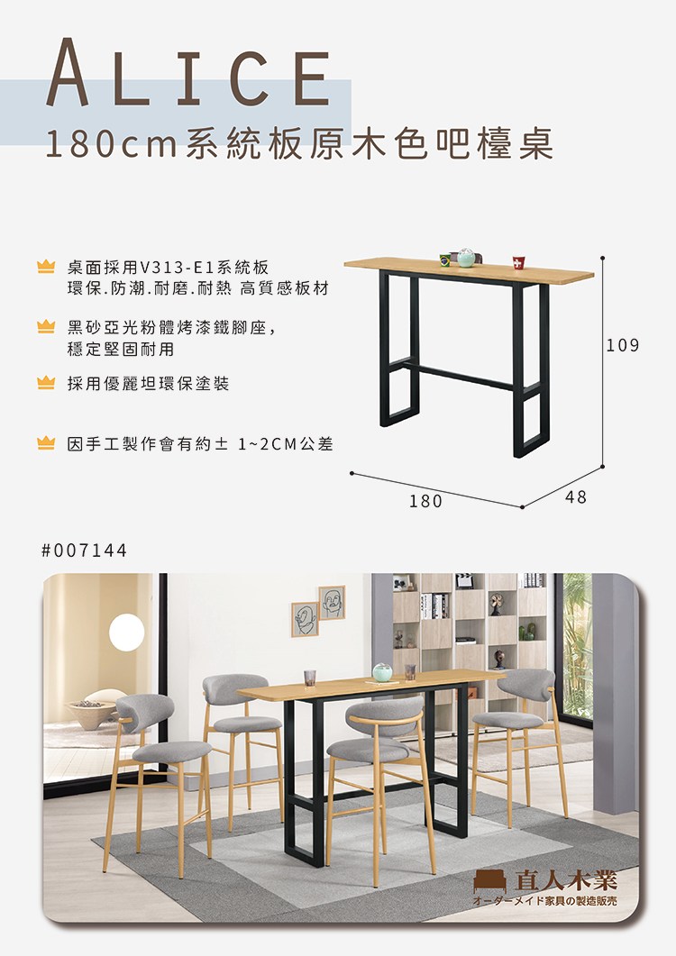 直人木業-ALICE系統板原木色吧檯桌180公分