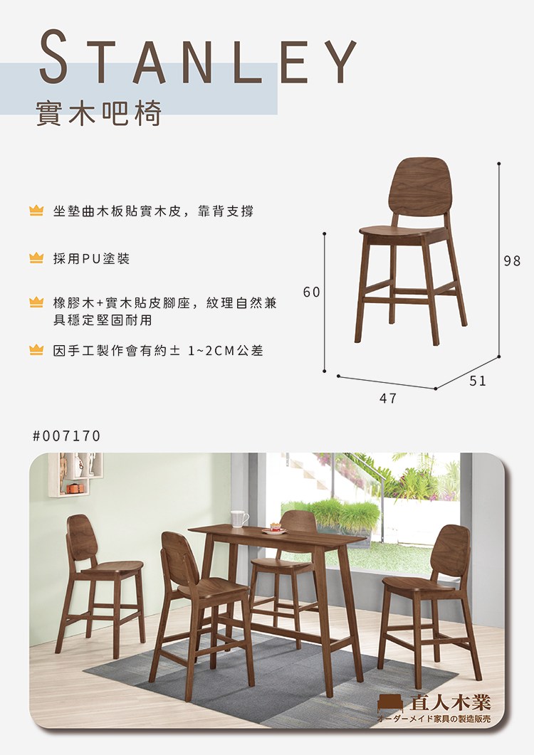 MUNA家居 史丹尼吧椅(板)(實木) 46.5X50.5X98cm