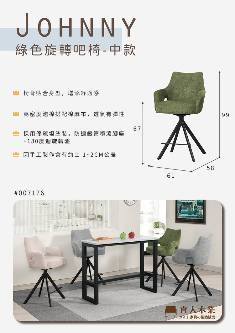 直人木業-JOHNNY綠色旋轉吧椅-中款