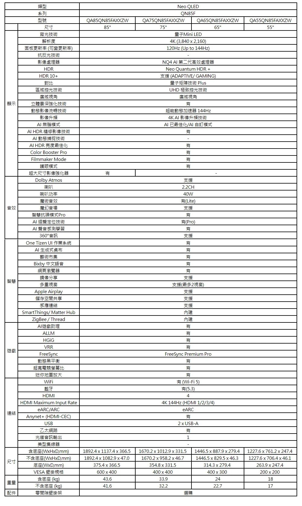 三星 SAMSUNG 55型 4K Neo QLED 144Hz Mini LED AI智慧顯示器 55QN85F QA55QN85FAXXZW