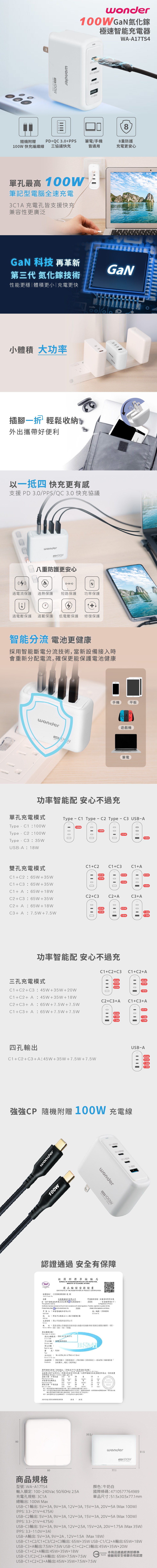WONDER旺德 100W GaN氮化鎵極速智能充電器 WA-A17TS4【愛買】