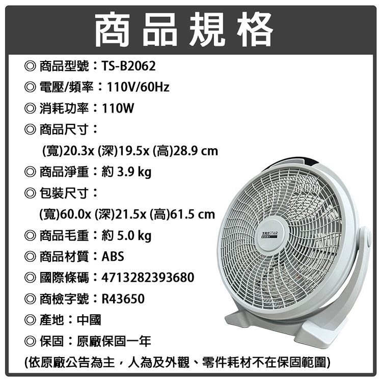 TRISTAR三星 20吋循環落地扇 TS-B2062