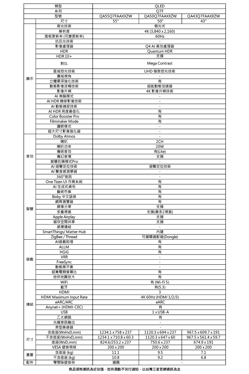 三星 SAMSUNG 43型 4K QLED AI 智慧顯示器 43Q7F QA43Q7FAAXXZW