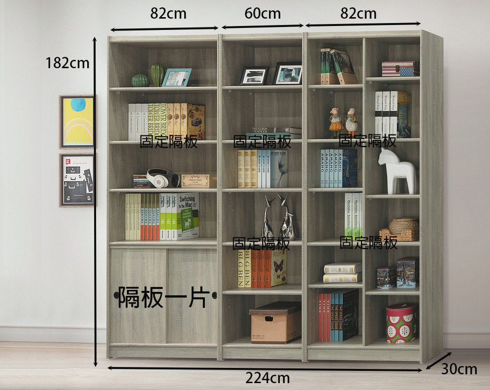 尺寸規格 寬 224 公分 X 深 30 公分 X 高 182 公分。