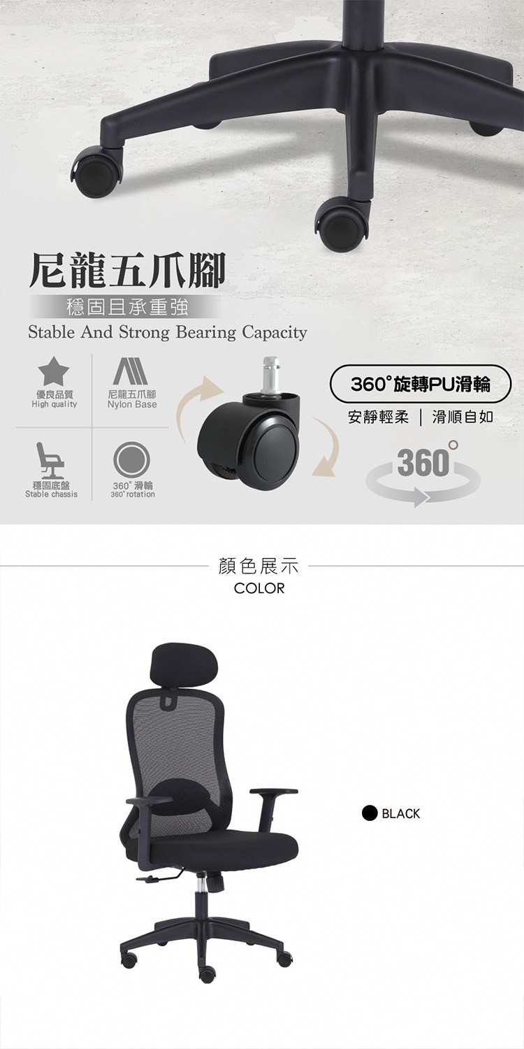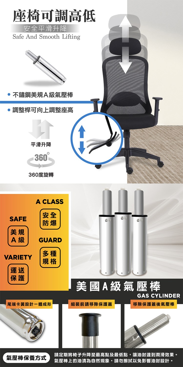 配備美規A級氣壓棒、安全升降,採尼龍五爪腳,堅固且承重性佳,360°旋轉靜音P.U.滑輪靈活移動。