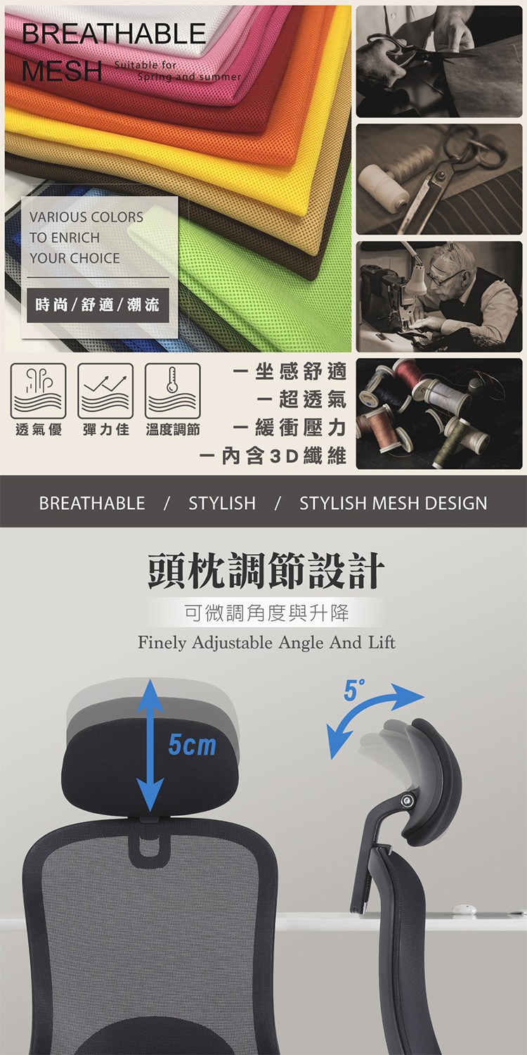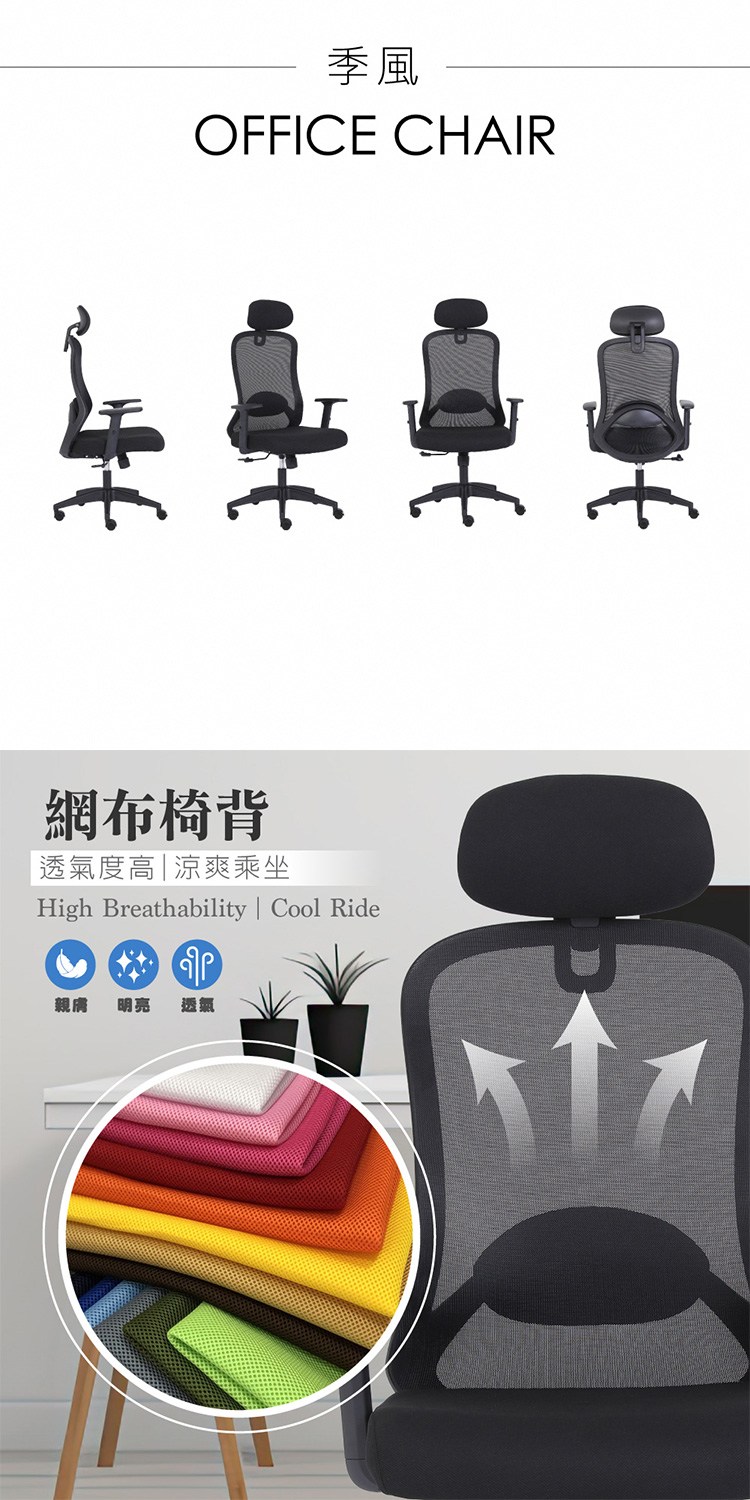 台灣與歐美同步販售、美規設計,透氣度高之網布椅背,涼爽乘坐,頭枕調節設計可微調角度與升降,