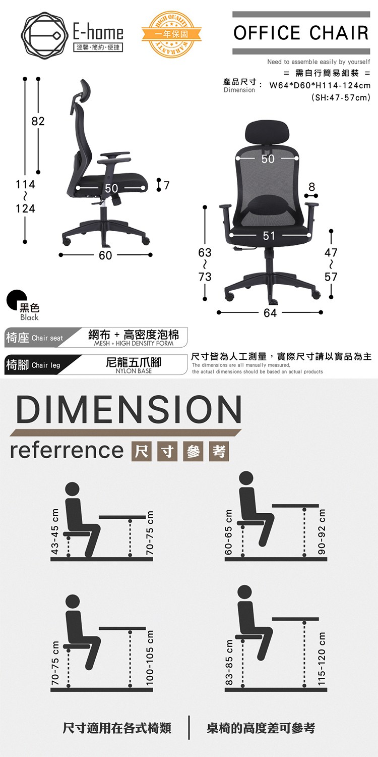產品尺寸:W64*D60*H114-124 cm(SH:47-57 cm)