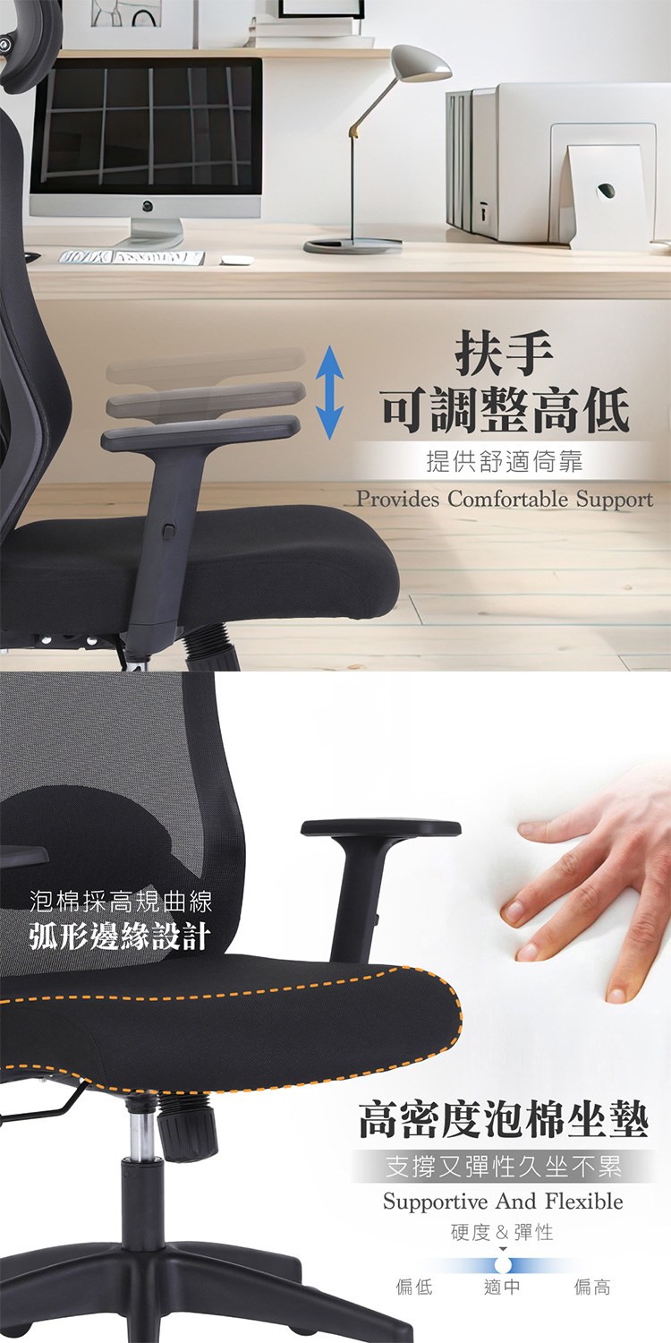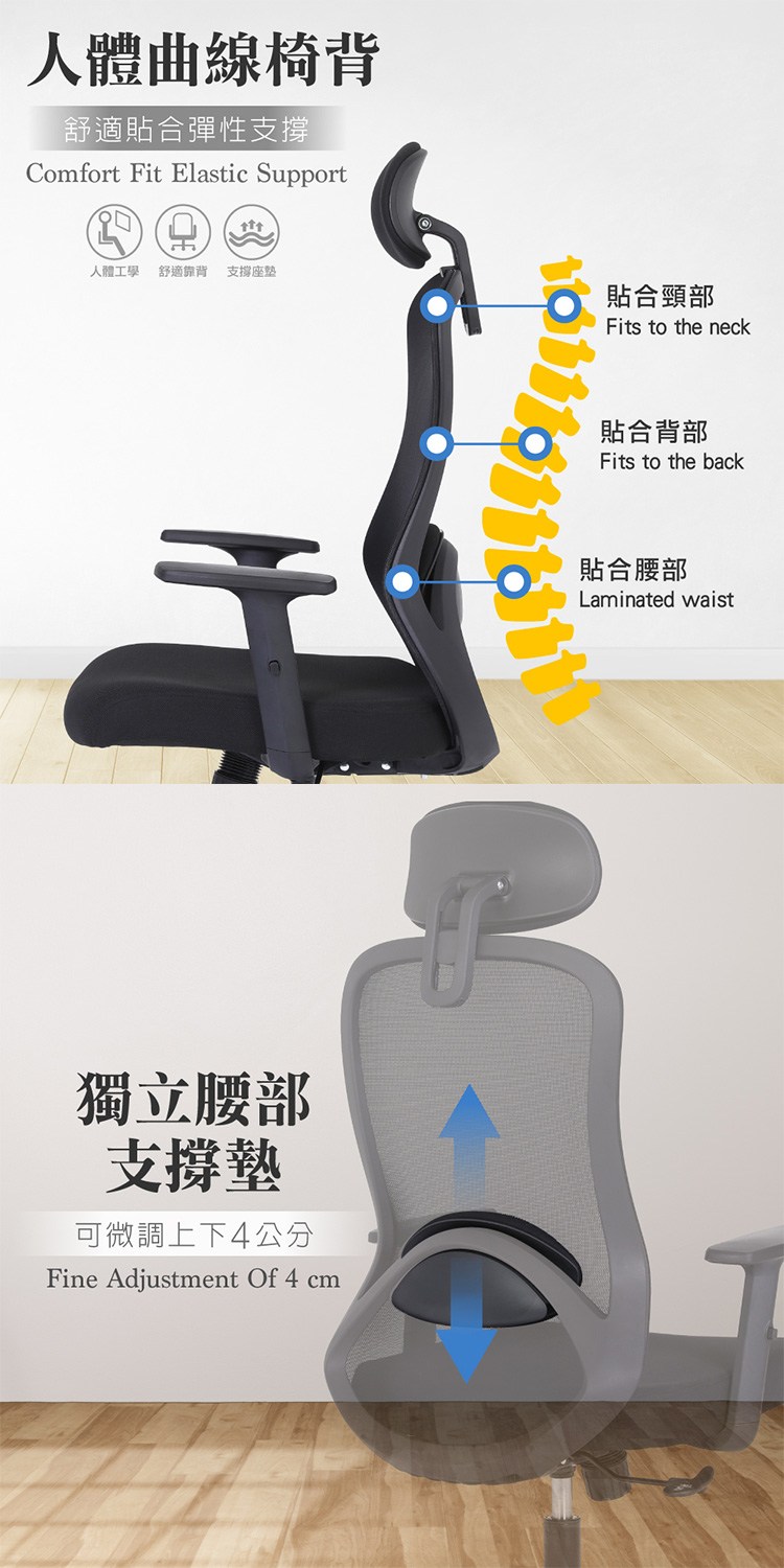 人體曲線椅背舒適貼合彈性支撐,獨立腰部支撐墊可微調上下4公分,扶手可調整高低,提供舒適倚靠,