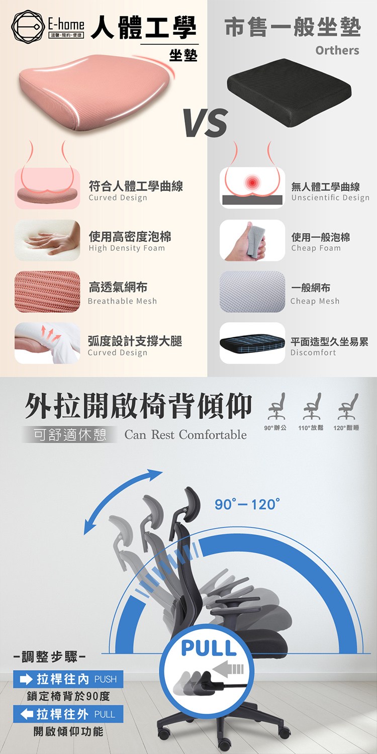 泡棉採高規曲線及弧形邊緣設計,高密度泡棉支撐又彈性久坐不累,外拉開啟椅座傾仰,可舒適休憩,