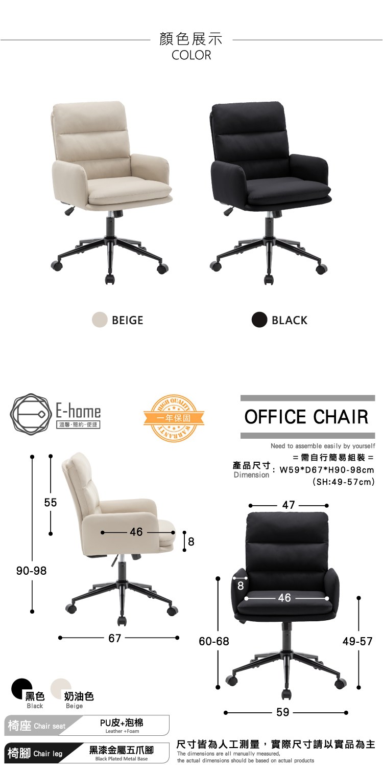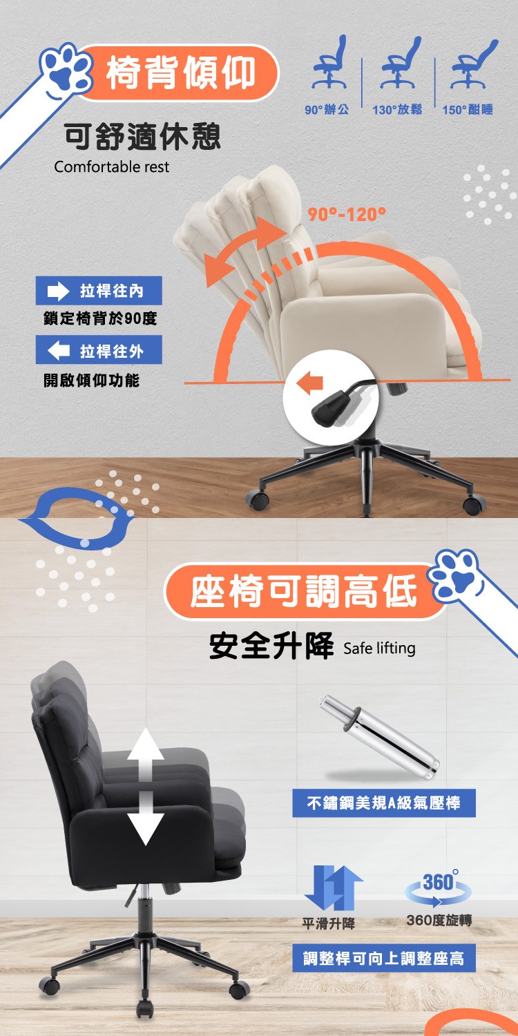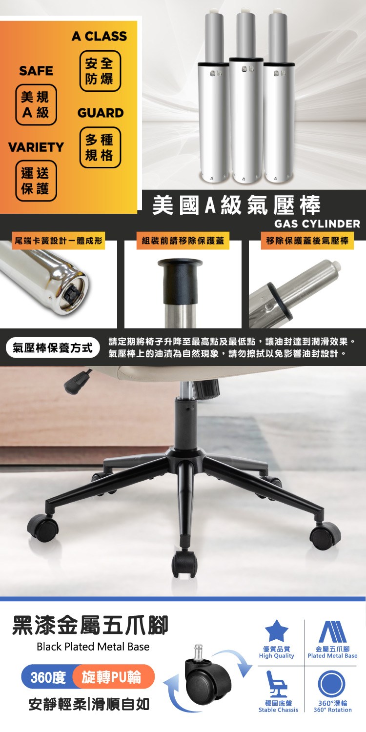 配備美規A級氣壓棒、安全升降,黑漆金屬五爪腳,穩固且承重強,360°旋轉靜音P.U.滑輪靈活移動