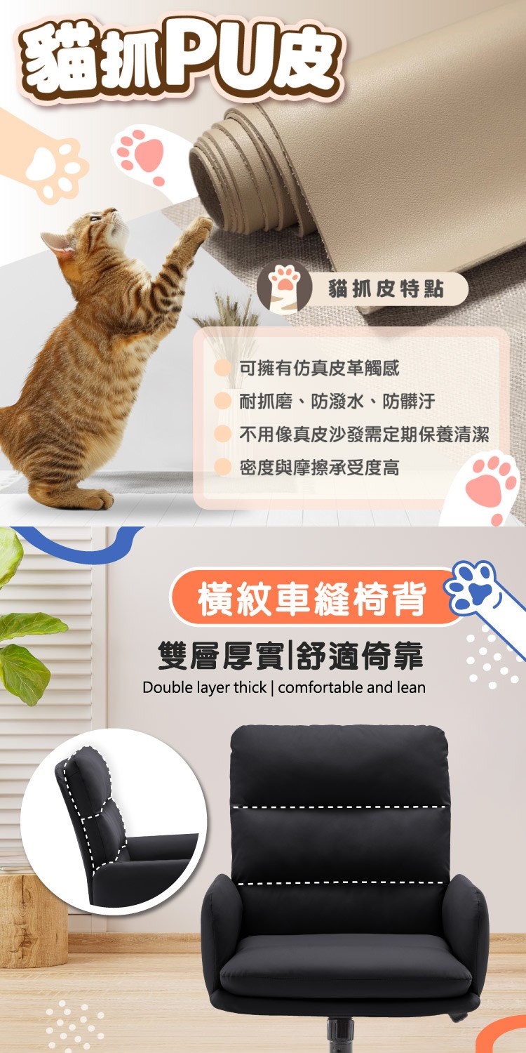 台灣與歐美同步販售、美規設計,防潑水PU貓抓皮設計滑順易清潔,雙層厚實橫紋車縫椅背舒適倚靠,