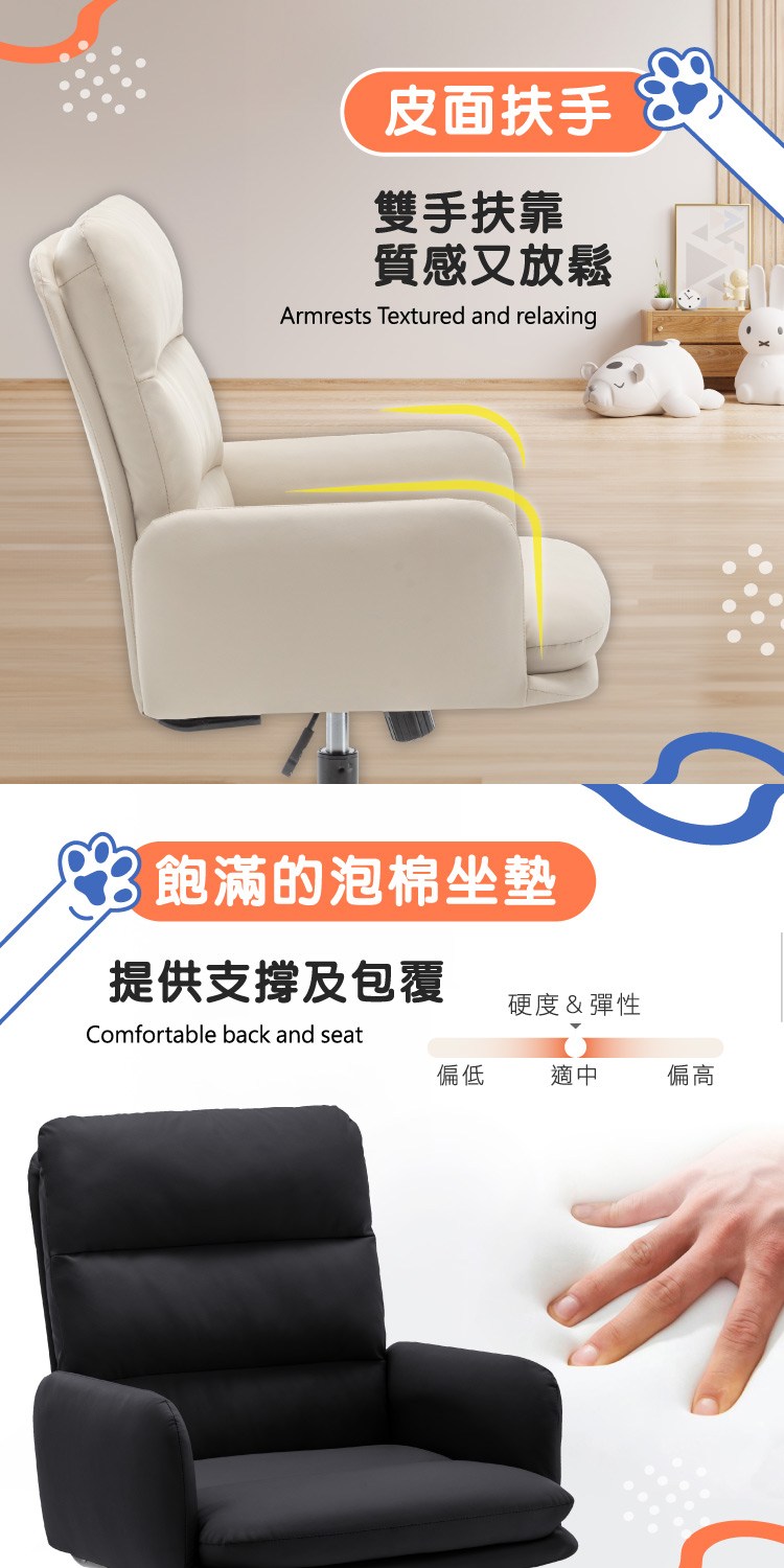 皮面扶手讓雙手扶靠質感又放鬆,飽滿的泡棉坐墊提供支撐及包覆,外拉開啟椅背傾仰,可舒適休憩,