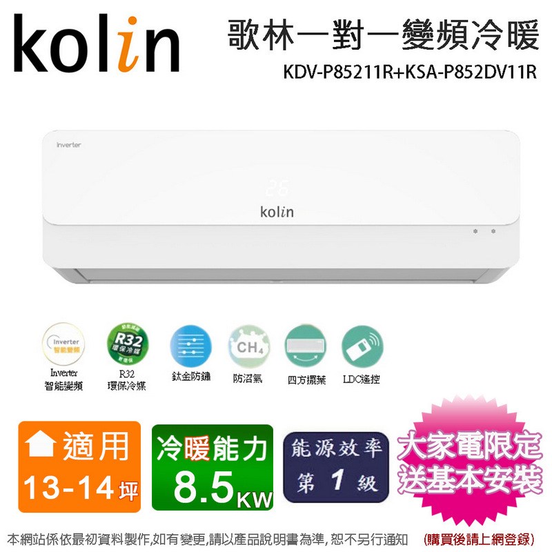 Kolin歌林13-14坪一級變頻冷暖分離式冷氣 KDV-P85211R+KSA-P852DV11R~含基本安裝+舊機回收