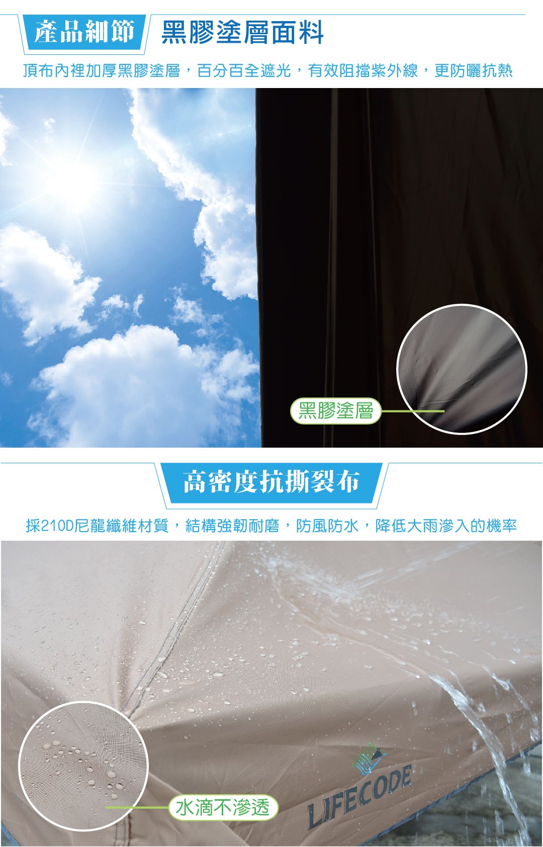 ☀️ 黑膠加厚塗層: 完全防曬遮光、耐水壓達 3000mm,有效抗雨