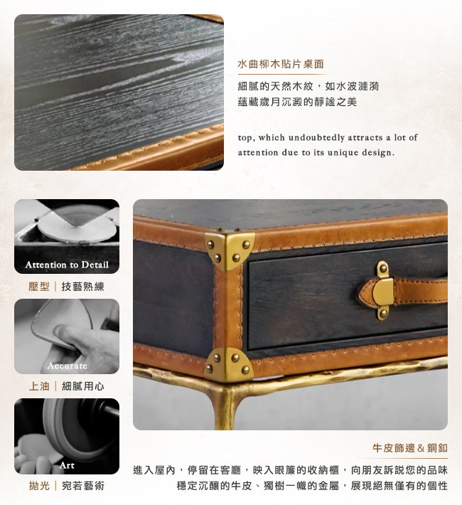 進入屋內,停留在客廳一會,映入眼簾的茶几,向朋友訴說您的品味。細膩的天然木紋桌面,如水波漣漪,蘊藏歲月沉澱的靜謐之美。獨樹一幟的金屬護角,展現絕無僅有的個性。奢華的巴西頭層厚牛皮飾邊與把手,呈現厚重、沈穩的印象。專注細節的設計,您選擇的不單單是茶几,而是生活的風格,令人印象深刻或是庸俗,取決在您的格調。手工鍛造金屬桌腳,工匠錘擊實心金屬,不對稱的美感,宛若獨一無二的藝術品,僅此一件。