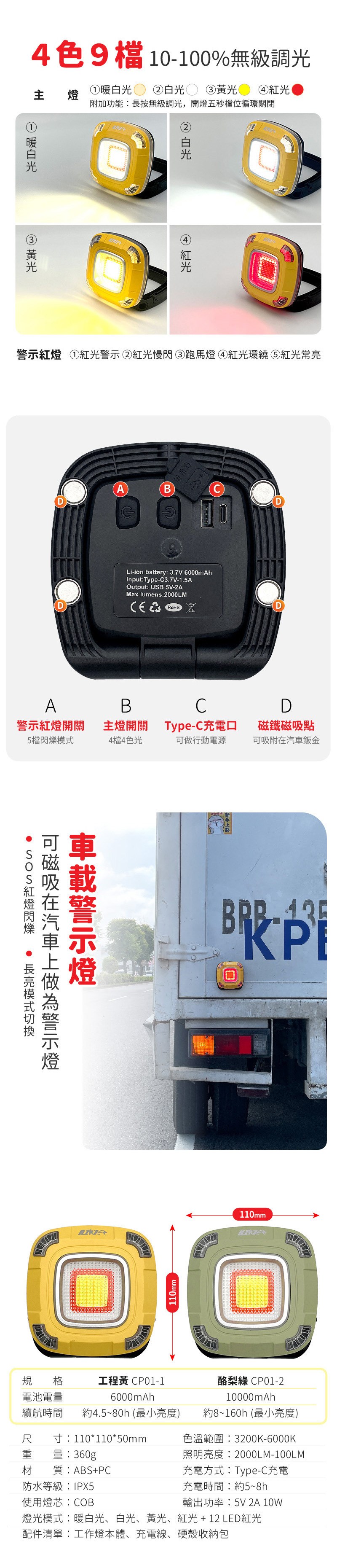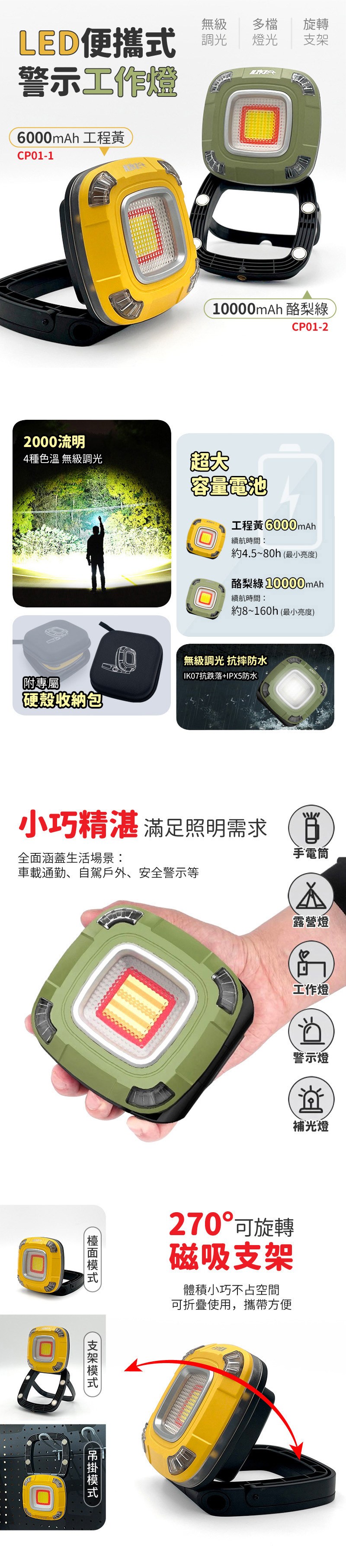 LED便攜式照明警示工作燈 6000mAh工程黃 (CP01-1)