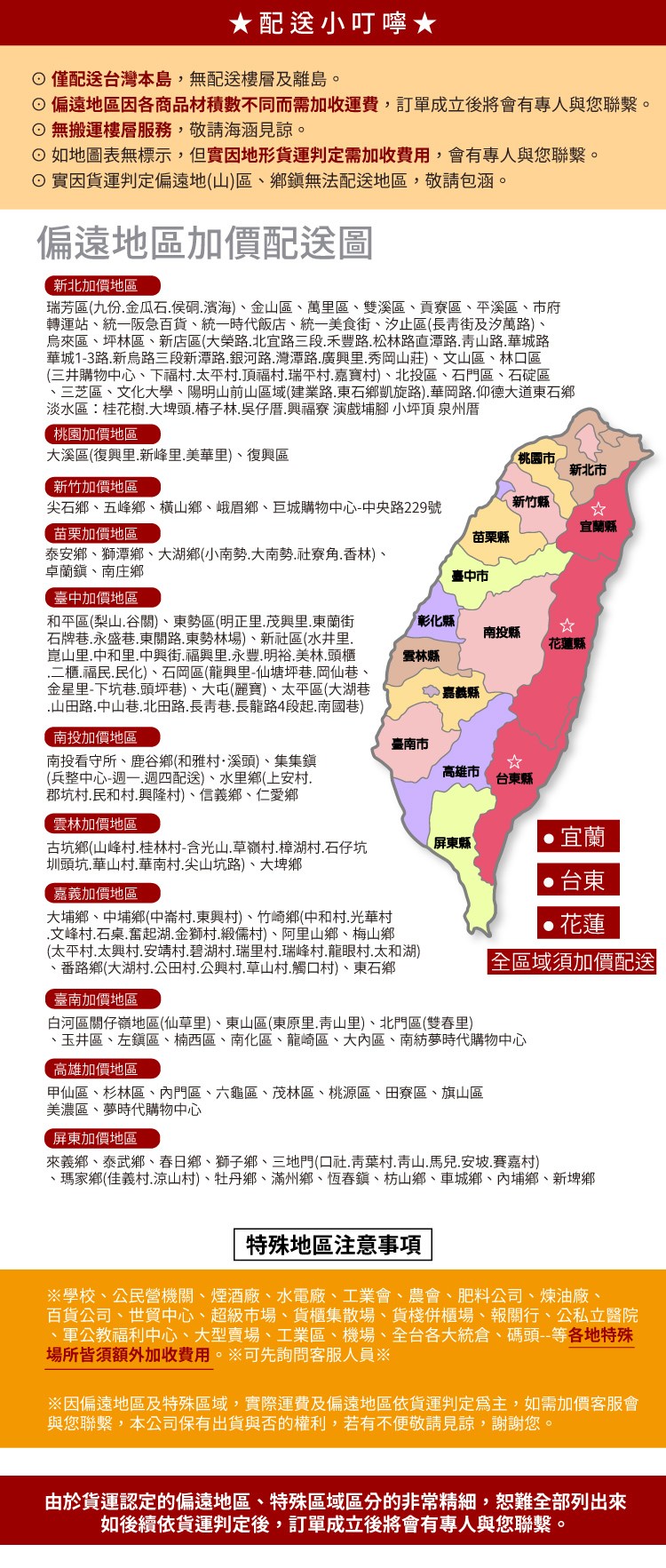 –如地圖表無標示但實因地形貨運判定需加收費用,會有專人與您聯繫。