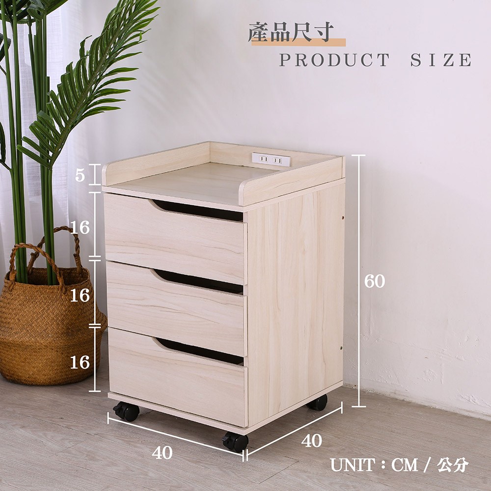 BuyJM 低甲醛附插座三抽附輪活動櫃/抽屜櫃/床頭櫃/公文櫃/檔案櫃淺楓木色