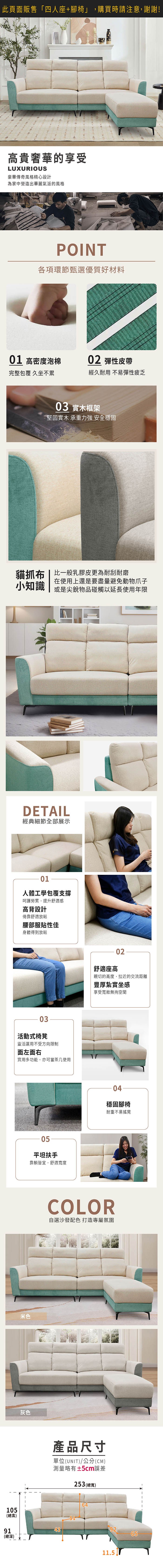 《潔西卡》湖水綠 貓抓皮 L型沙發三人座 腳凳 深灰色 淺灰色 現代 簡約 高背款 客廳 辦公室 台灣製造 【新生活家具】