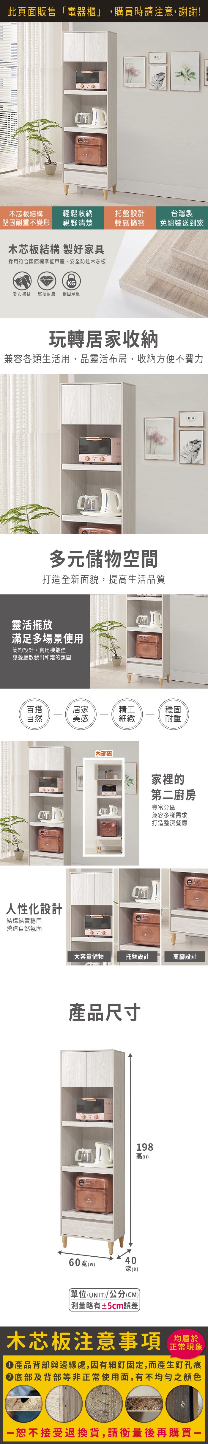 Boden-貝奈2尺收納高餐櫃/碗盤置物櫃/拉盤電器櫃-60x41x192cm