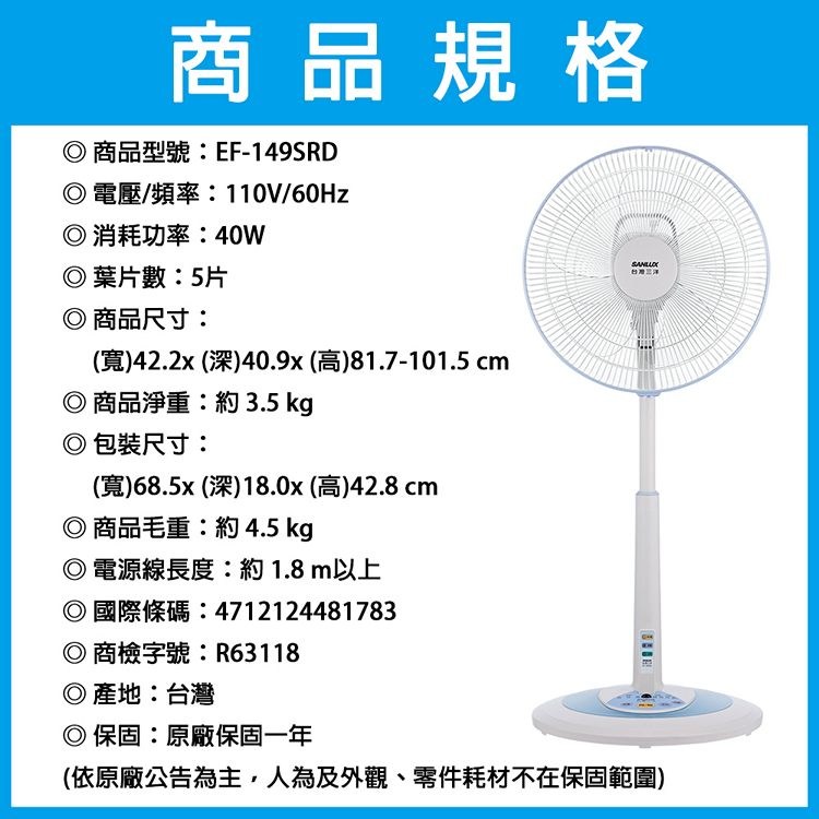 SANLUX台灣三洋 14吋遙控定時立扇.電風扇 EF-149SRD