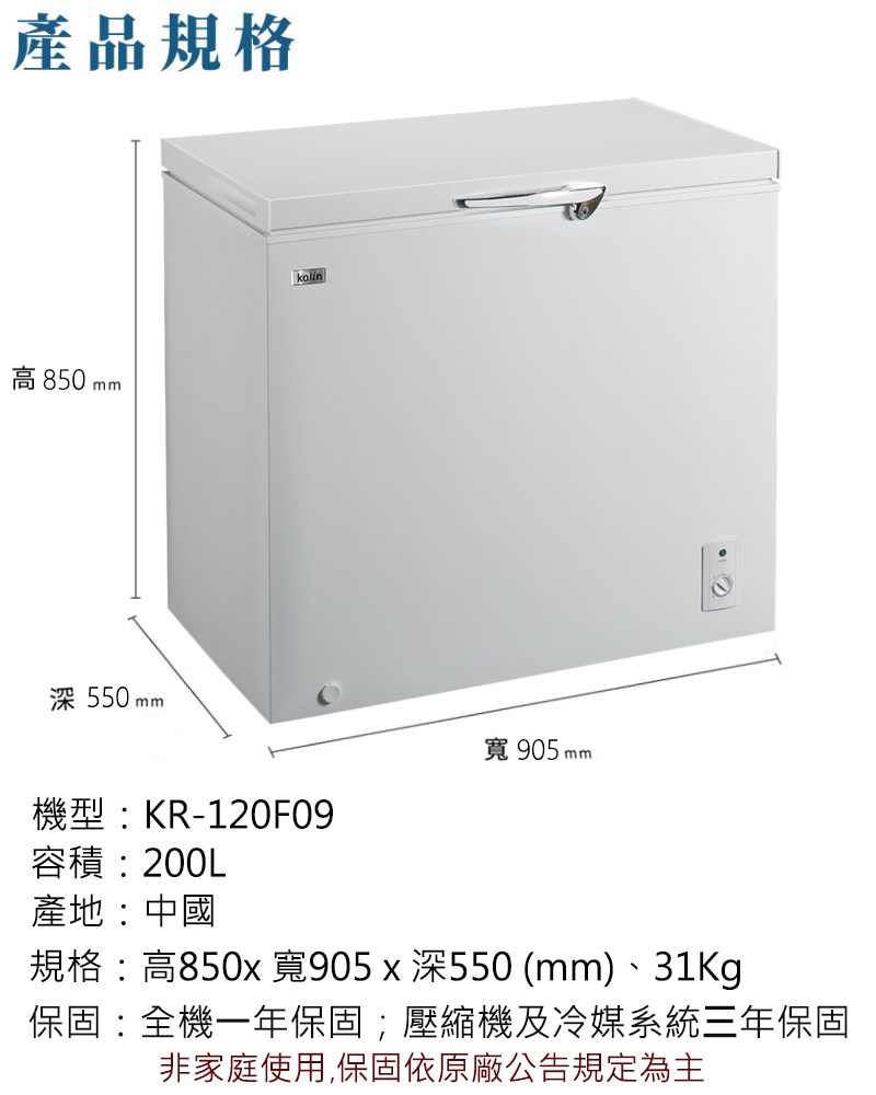 Kolin歌林200公升上掀臥式冷凍櫃 KR-120F09~含拆箱定位+舊機回收