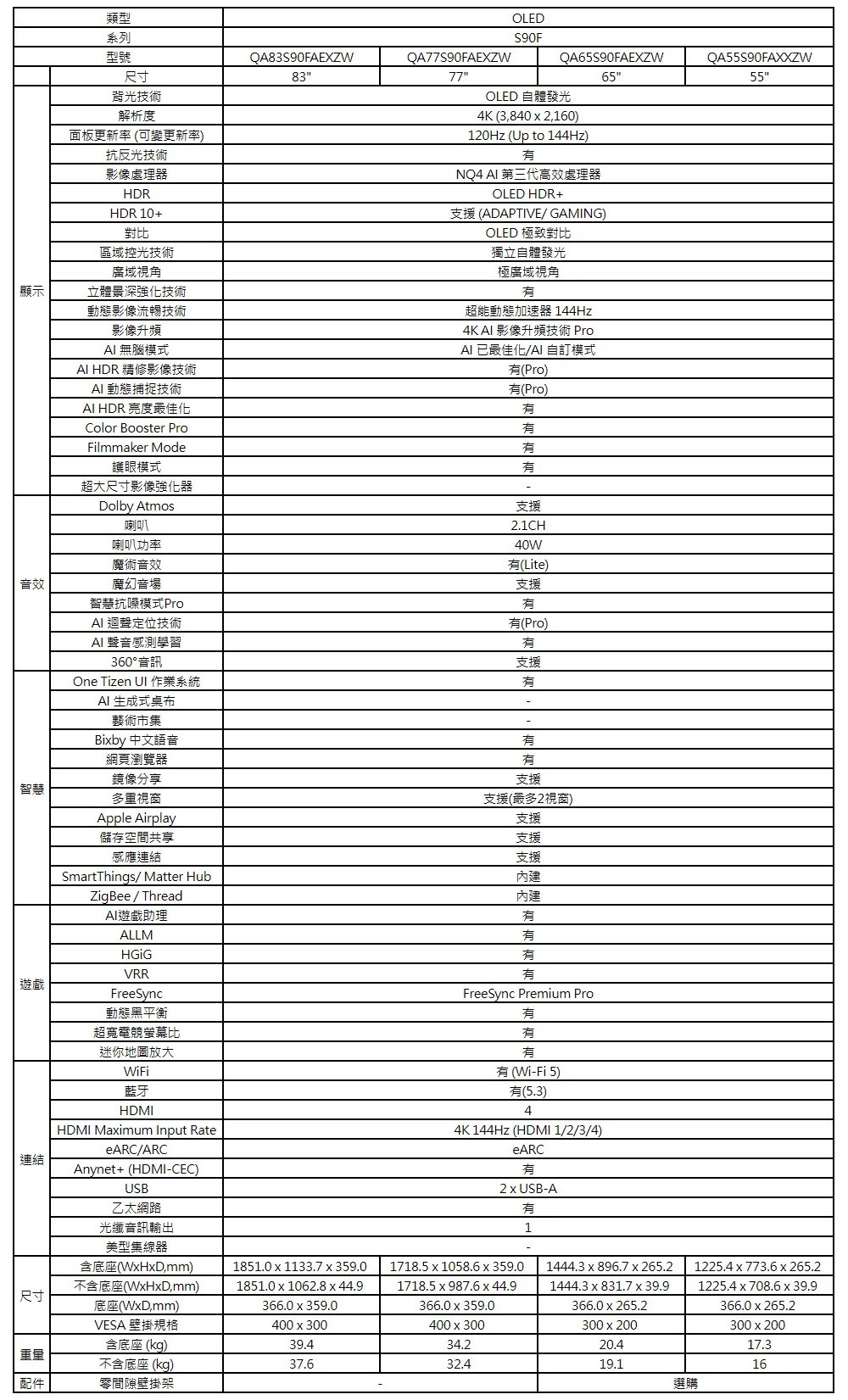 三星 SAMSUNG 83型 4K 144Hz OLED AI智慧顯示器 83S90F QA83S90FAEXZW