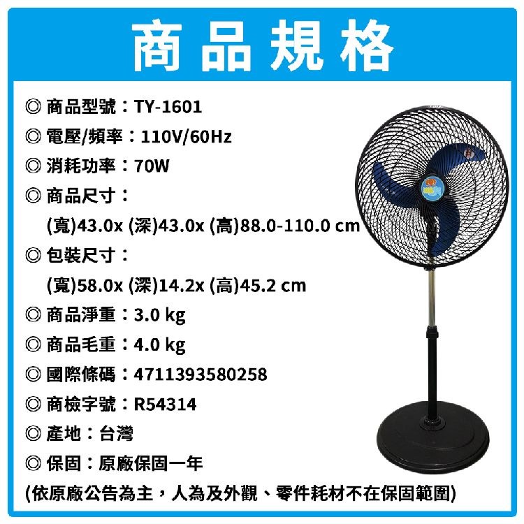 涼風爽 16吋擺頭立扇.電風扇 TY-1601