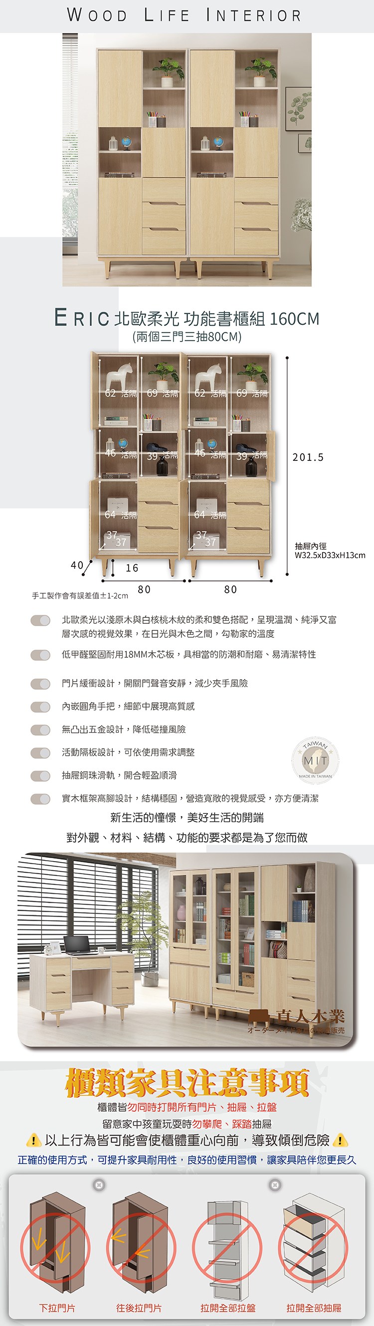 直人木業-ERIC北歐柔光三門三抽書櫃組160公分(兩個三抽80公分)