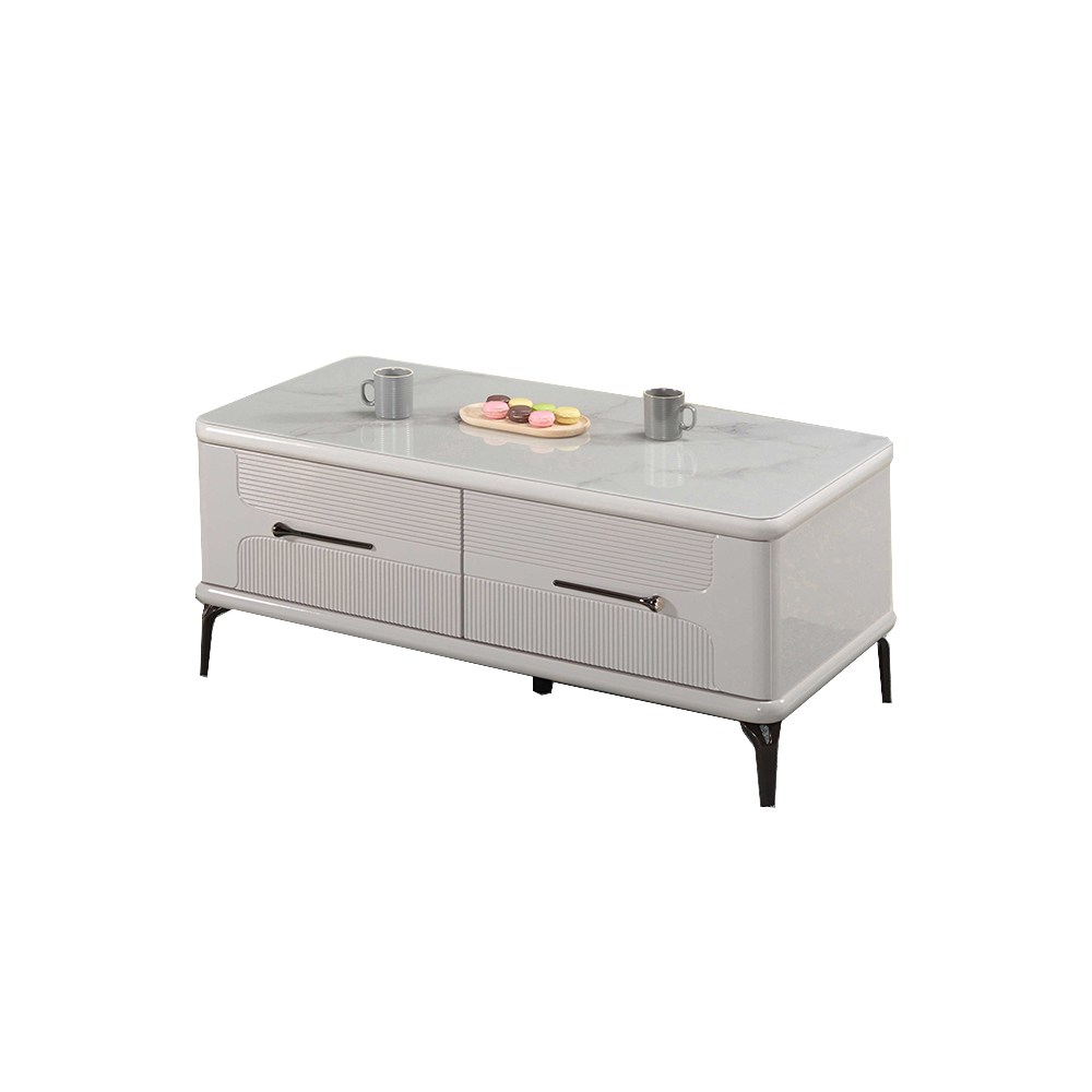 材質: 高級 MDF 打造 + 3mm 仿大理石紋強化玻璃 + 15cm 防鏽烤漆鐵灰色鐵腳 五 金 抽屜採高級鋼珠滑軌 抽屜採高級鋼珠滑軌塗 裝 PU 亮面烤漆