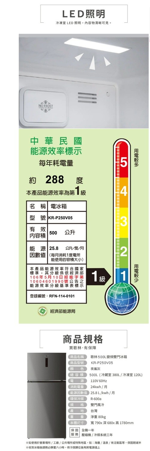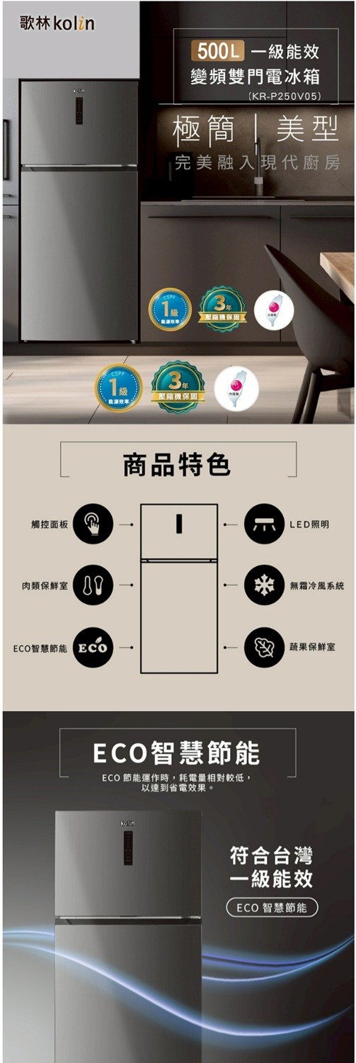 Kolin 歌林 500公升一級變頻雙門電冰箱 KR-P250V05