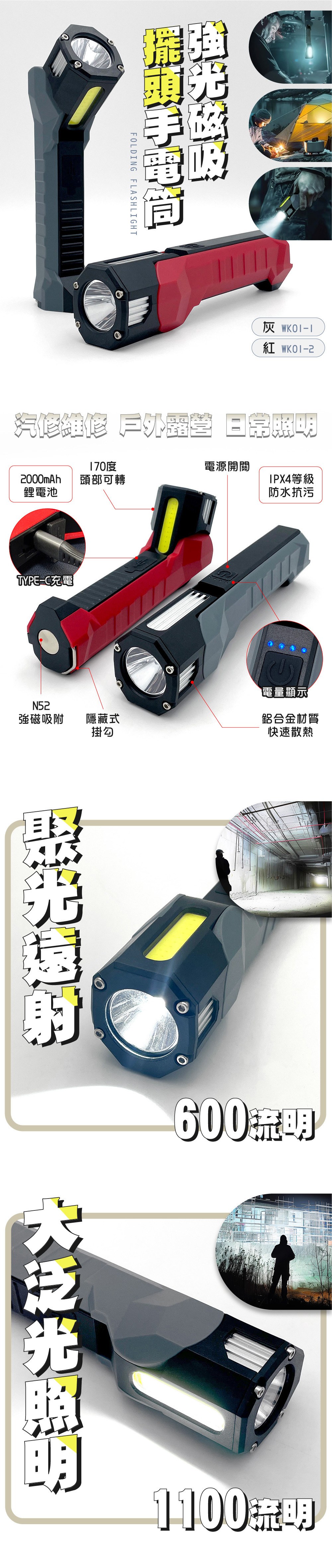 COB強光磁吸擺頭手電筒-2色紅色 WK01-2