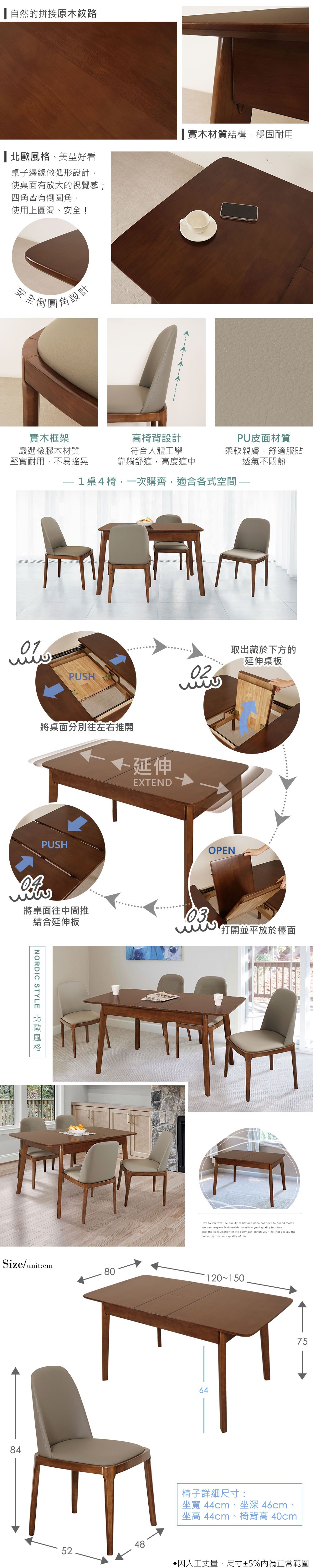 文創集 德莉特4尺可伸縮實木餐桌布餐椅組合(一桌四椅組合+120-150cm伸縮使用)-120-150x75x75.5cm免組