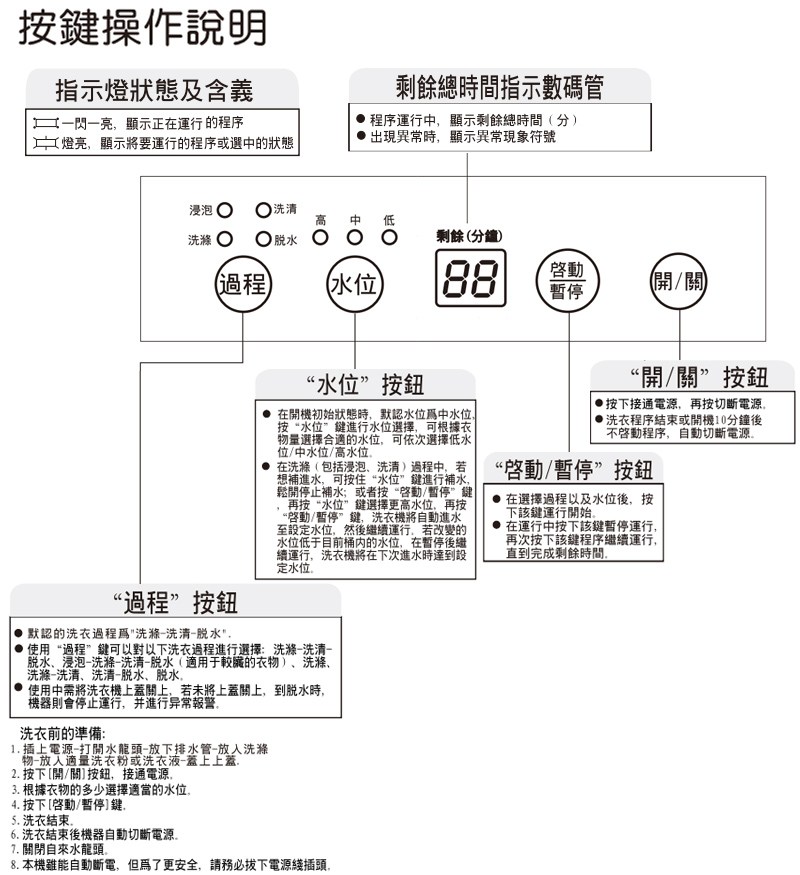 ◆浸泡、洗滌、洗清、脫水四種洗衣過程
