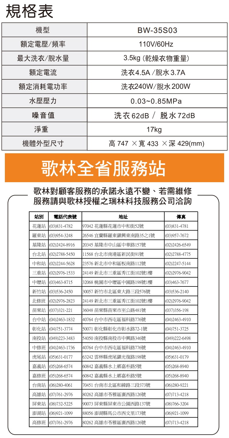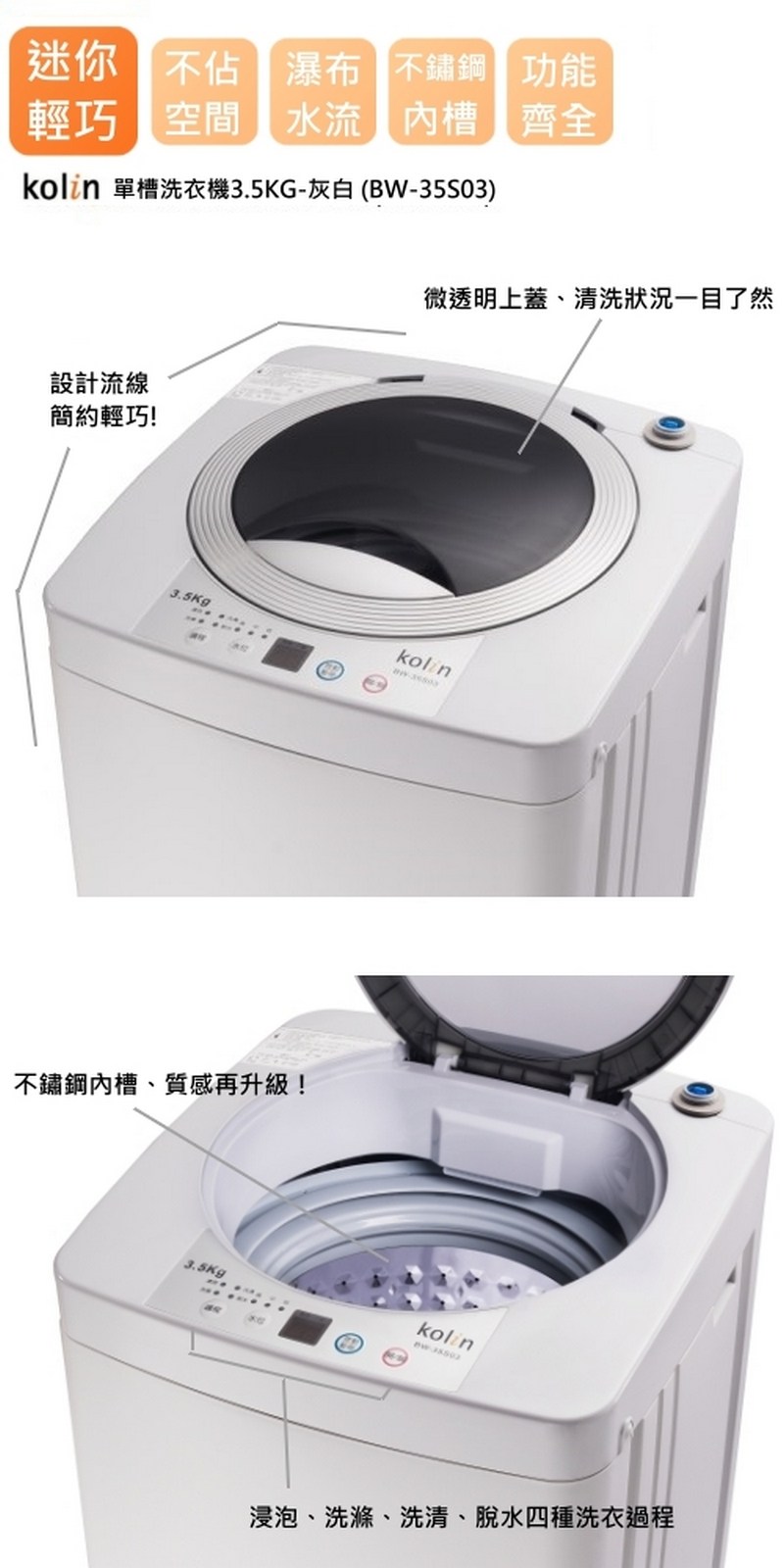 Kolin歌林3.5公斤定頻單槽洗衣機 BW-35S03~含基本安裝+舊機回收