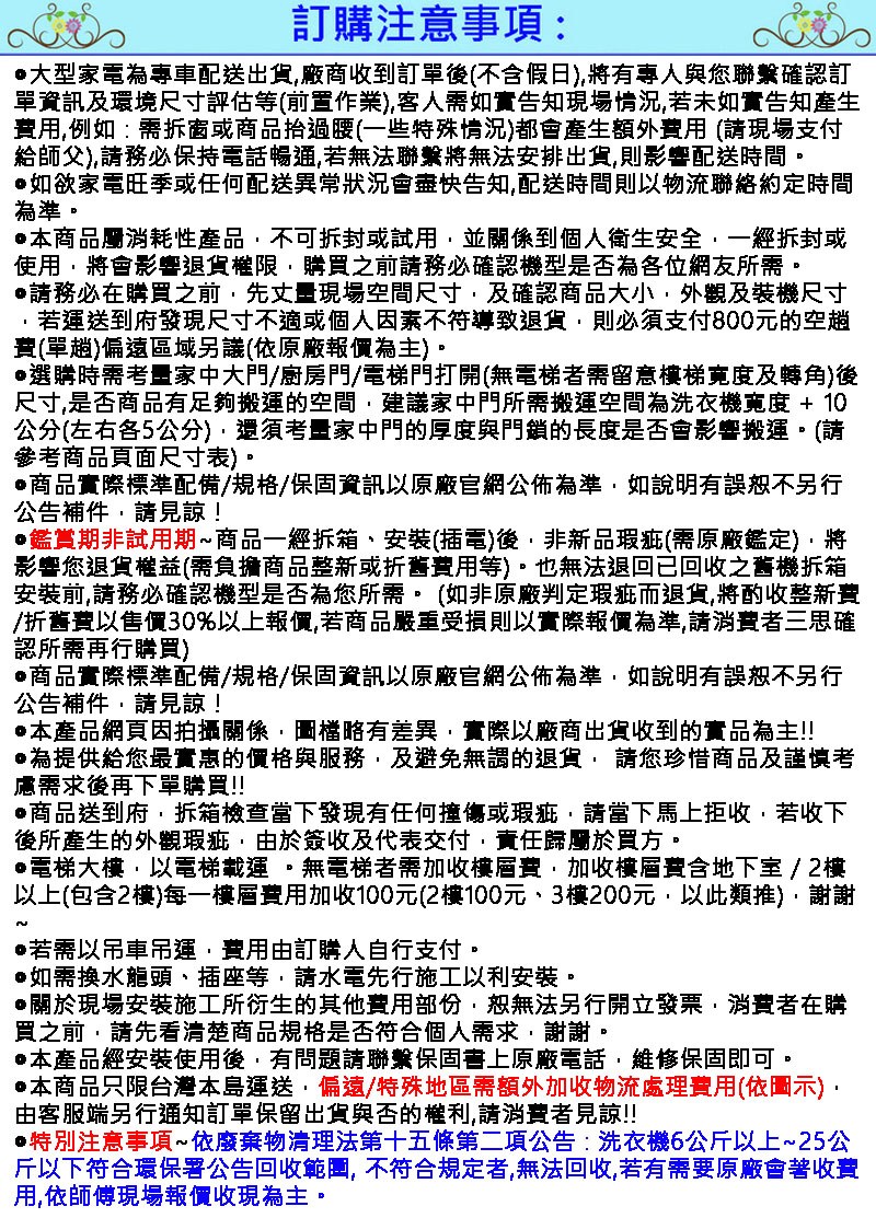 ◎特別注意事項~依廢棄物清理法第十五條第二項公告 : 洗衣機6公斤以上~25公斤以下符合環保署公告回收範圍, 不符合規定者,無法回收,若有需要原廠會著收費用,依師傅現場報價收現為主。
