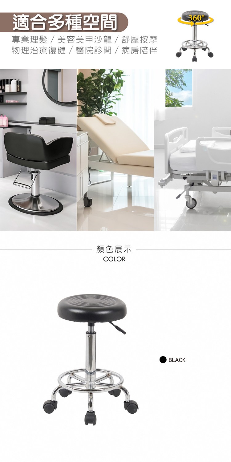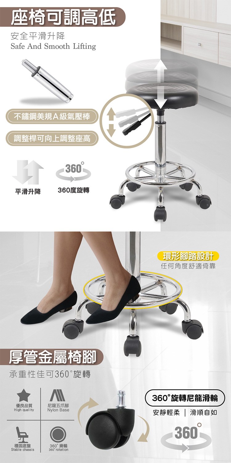 環形腳踏設計任何角度舒適倚靠,360°旋轉尼龍滑輪、靈活且耐磨,適合專業理髮店及美容美甲沙龍,