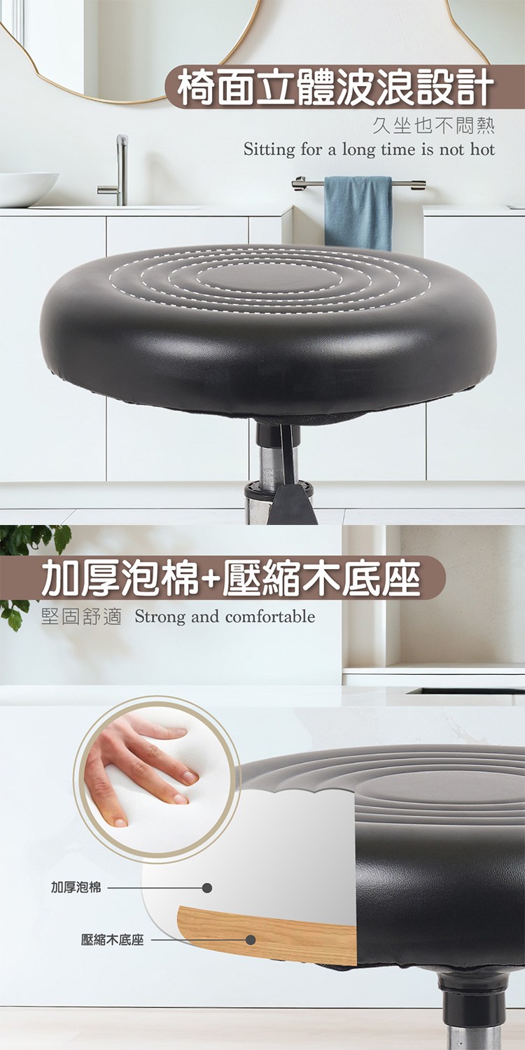 加厚泡棉及壓縮木底座堅固舒適,配有美規A級氣壓棒、安全升降,厚管金屬椅腳承重性佳可360°度,