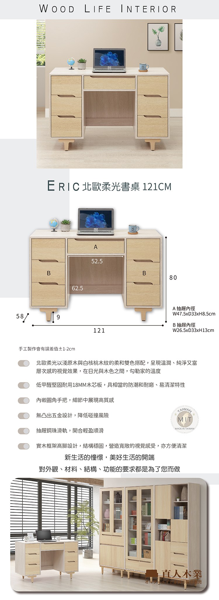 直人木業-ERIC北歐柔光書桌121公分