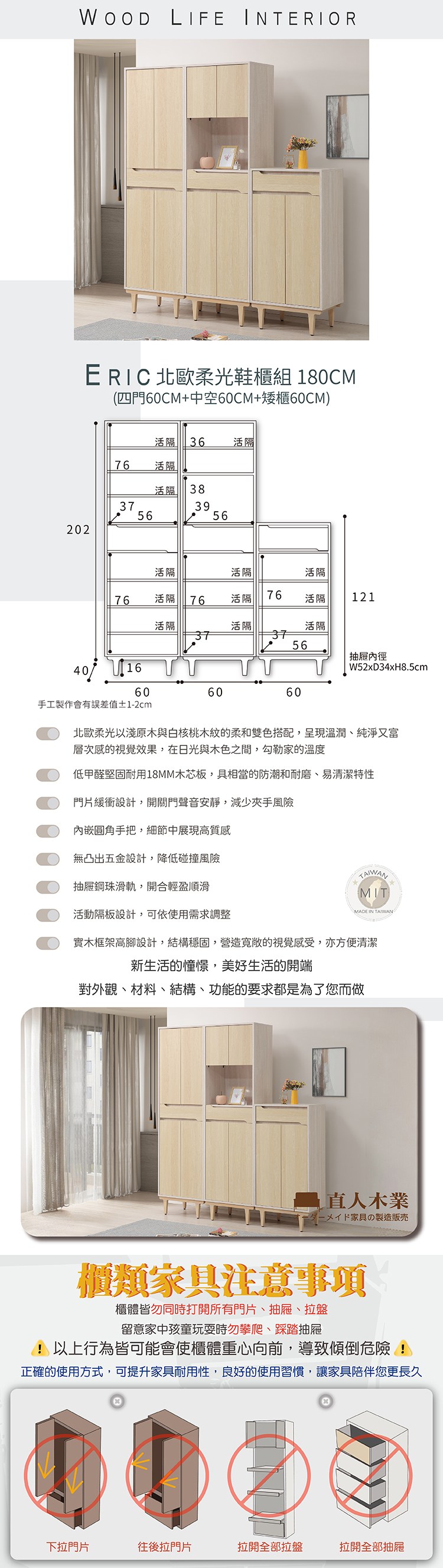 直人木業-ERIC北歐柔光鞋櫃組180公分(四門款+中空款+矮櫃)