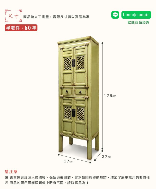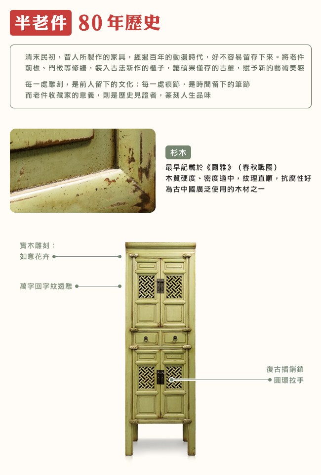 清末民初,昔人所製作的家具,經過百年的動盪時代,好不容易留存下來。將老件前板、門板等修繕,裝入古法新作的櫃子,讓碩果僅存的古董,賦予新的藝術美感。每一處雕刻,是前人留下的文化;每一處痕跡,是時間留下的筆跡。而老件收藏家的意義,則是歷史見證者,篆刻人生品味。
