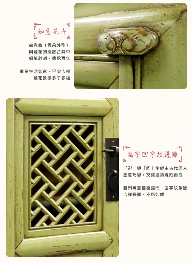 門板上的「如意花卉」,是如意紋(雲朵外型)與蓮花初綻融合其中,細膩雕刻,傳承百年。寓意生活如意,平安吉祥,蓮花象徵多子多福。萬字回字紋透雕。「卍」與「回」字經由古代匠人的創意巧思,交錯連續雕刻而成。雙門寓意雙喜臨門;回字紋象徵吉祥長壽、不絕如縷。