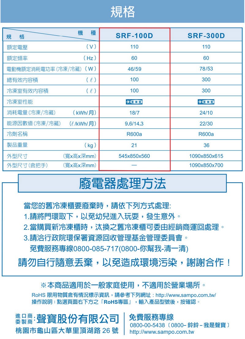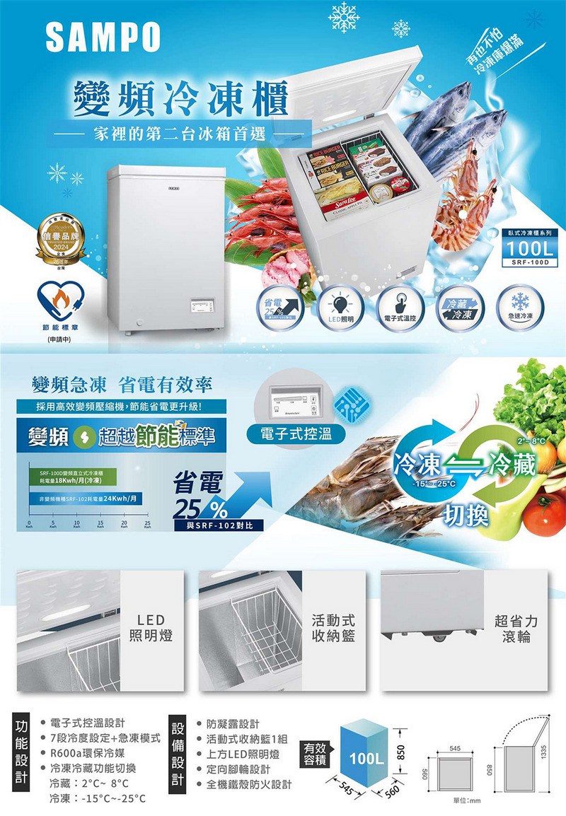 SAMPO聲寶100公升變頻臥式冷凍櫃/冷凍冷藏兩用櫃 SRF-100D~含拆箱定位+舊機回收