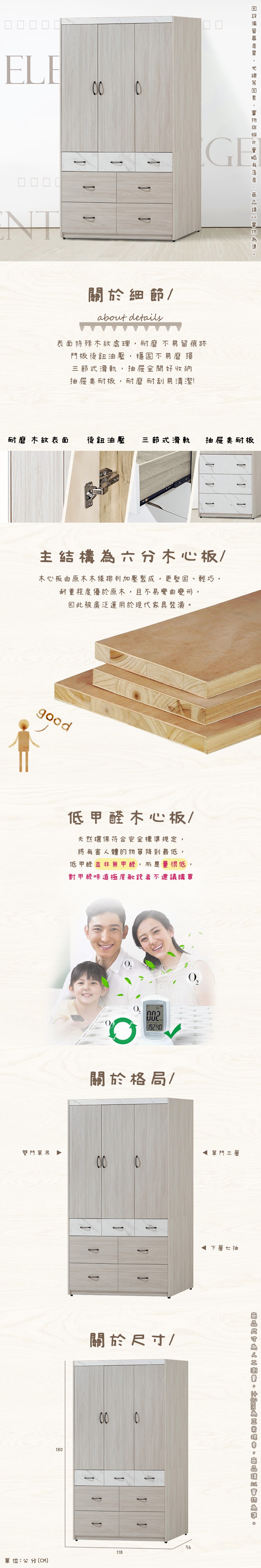 文創集-南亞塑鋼 安格 南亞塑鋼4尺三開門六抽衣櫃/收納櫃-121.2x60.4x200cm免組