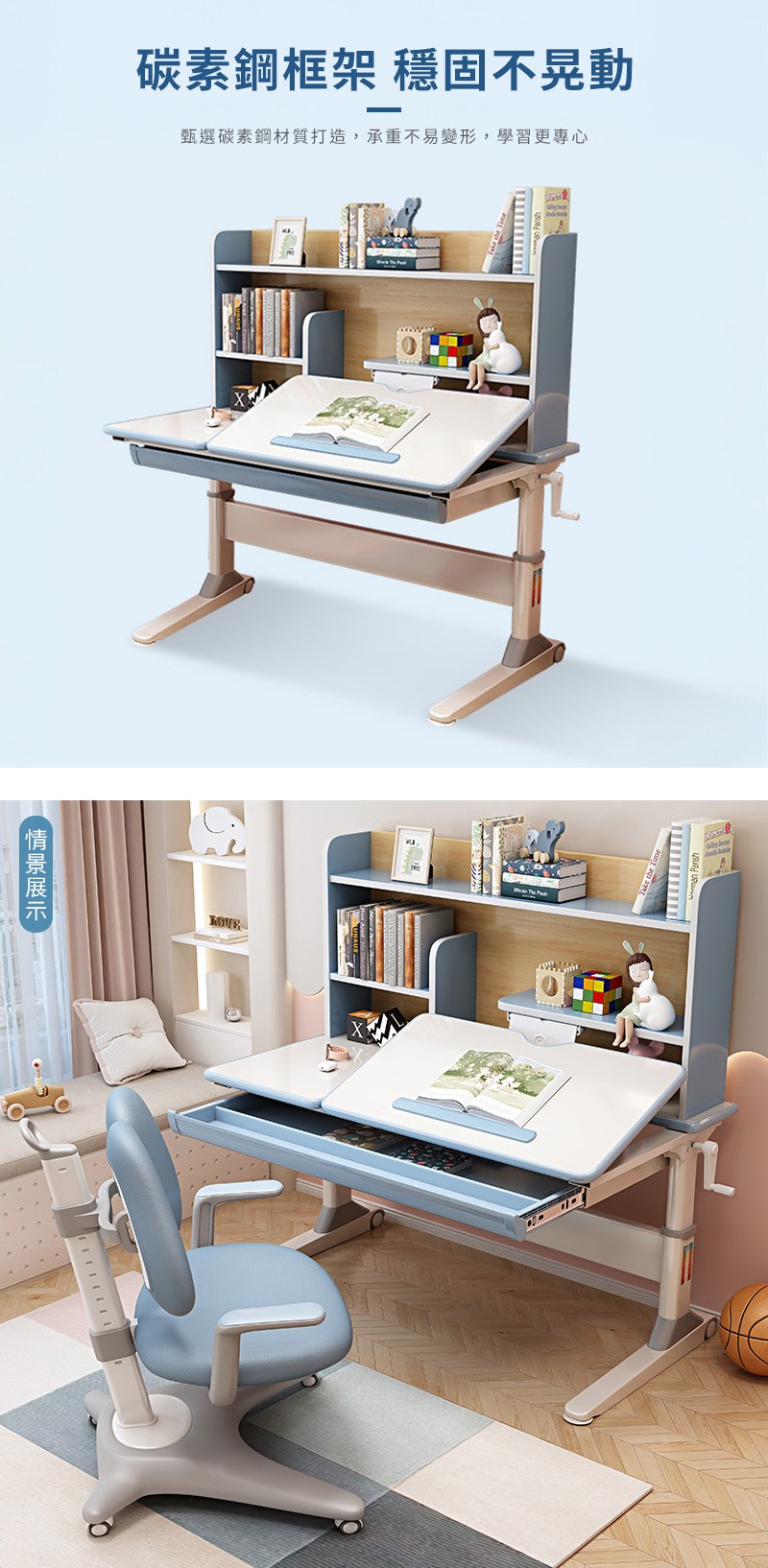E-home GUGU古古多功能書架雙抽陪讀兒童升降成長桌-寬120cm-三色可選藍色