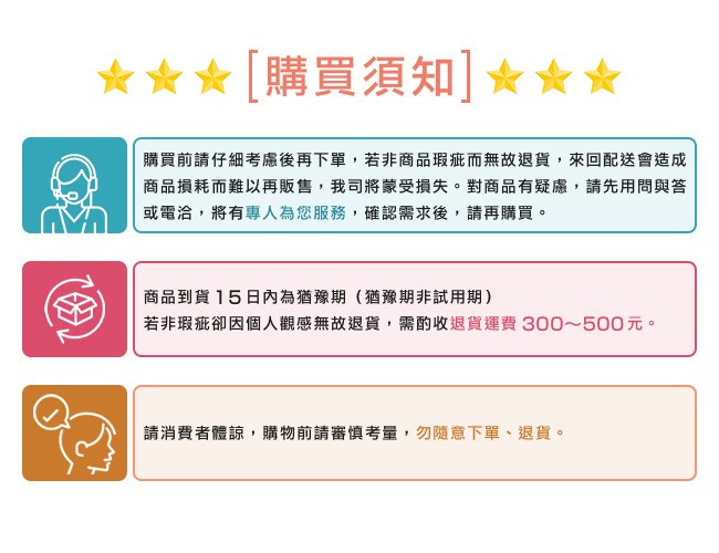 ※購買前請仔細考慮後再下單,若非商品瑕疵而無故退貨,來回配送會造成商品損耗而難以再販售,我司將蒙受損失。對商品有疑慮,請先用問與答或電洽,將有專人為您服務,確認需求後,請再購買。