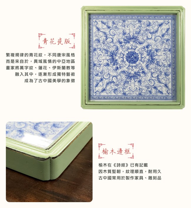 青花瓷紋,源於元代,白地藍花。明朝大成,有一說「永樂宣德,青花之王」。在繁複的花葉間,展開獨特的藝術美感。青花瓷版:繁複規律的青花紋,不同於唐宋淡雅風格,而是來自於,異域風情的中亞地區。畫家將萬字紋、蓮花、伊斯蘭教等意象,融入其中,逐漸形成獨特藝術,成為了古中國美學的象徵。榆木在《詩經》已有記載,因木質堅韌,紋理順直,耐用久。古中國常用於製作家具、雕刻品。