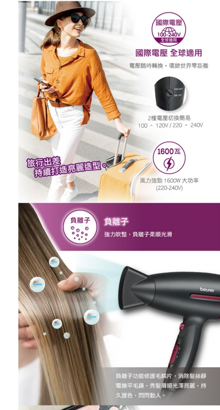 1600W(220V-240)強大風力,出國使用也能像在家一樣輕鬆吹整秀髮。