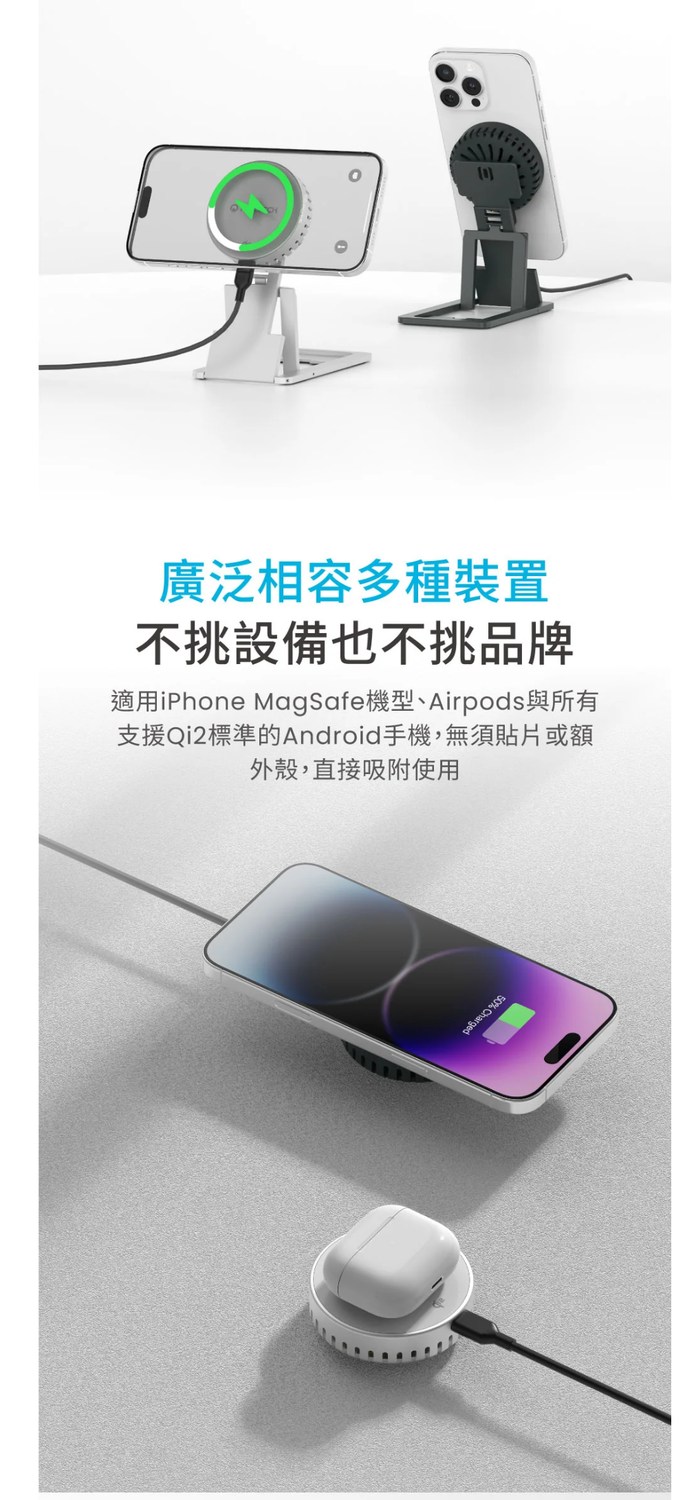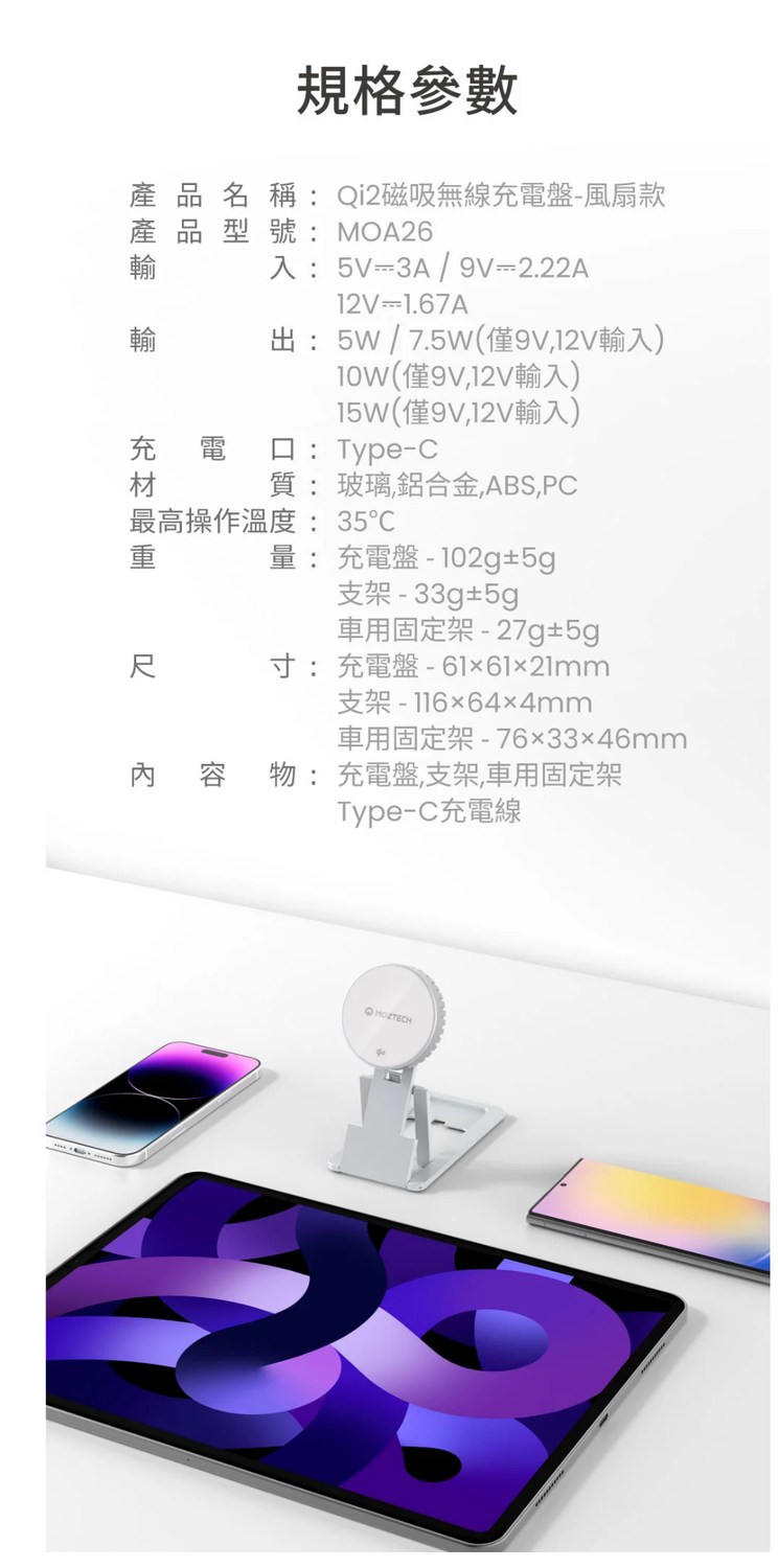 MOZTECH® Qi2 磁吸無線充電盤(風扇款) 型號 MOA26 白