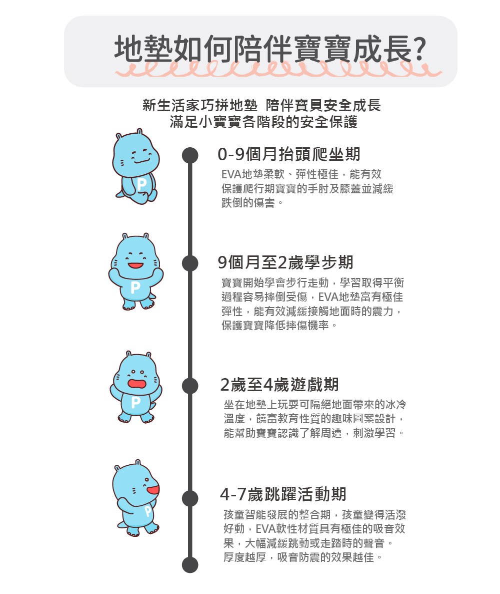 【緩衝】 EVA地墊富有極佳的彈性,能有效減緩接觸地面時的震力,可保護孩童及年長者,降低跌倒、碰撞到堅硬地面時所造成的傷害。